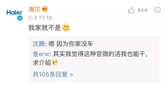 第一、运营官微就像谈恋爱。但你若即若离的撩几下,停下来,对方会想“死鬼这么还不来?”这一点在官微追热点的时候表现的特别明显。春节期间海尔上了很多明星的微博热门,网友评论“又来了”“海尔一天天活跃的像个高仿”。结果海尔突然消停了,消停的这段时间大家热评区几乎清一色的都是“海尔怎么还没来?”“我帮海尔占个位置”。