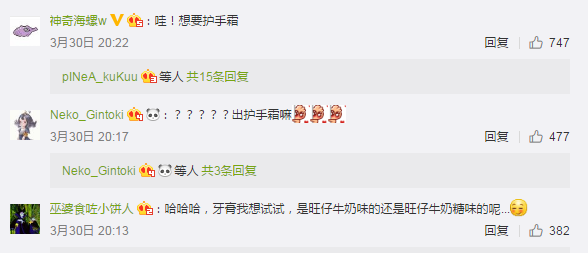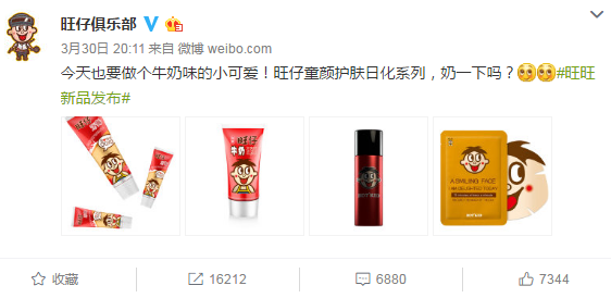 今年愚人节,旺旺又继续在产品上搞起了事情,甚至玩起来起了“跨界”。当牛奶味的牙膏、牛奶洗面奶、牛奶面膜等脑洞大开的单品在微博一经发布后,就瞬间吸引了大批网友的围观,评论区表示要购买的人数不在少数。截至目前,@旺仔俱乐部的这条微博已获得了16212次转发、6880条评论和7344个点赞。