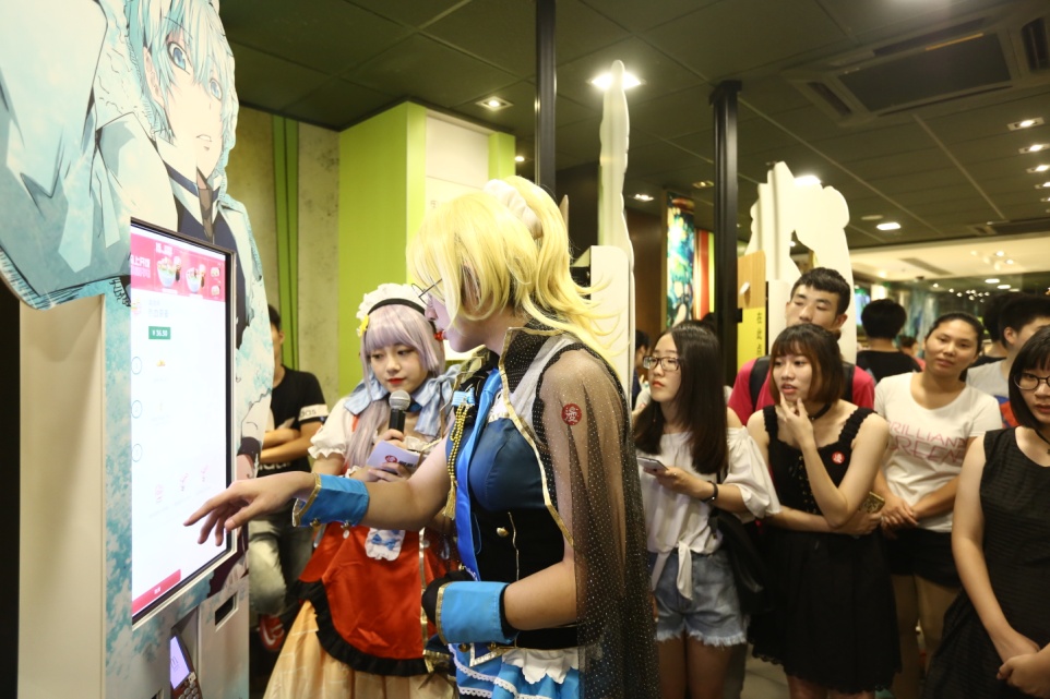 活动期间,餐厅里还举办次元派对,漫迷COSER,宅舞PK,游戏周边布满整个餐厅。在互动中,不难发现有一个元气美少女,穿着萝莉裙的萌娘角色格外引人注目,她出现在每一个主题餐厅中,并不时耐心指导二次元小伙伴们如何使用自助点餐机。