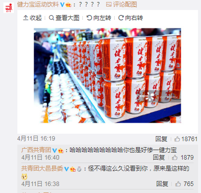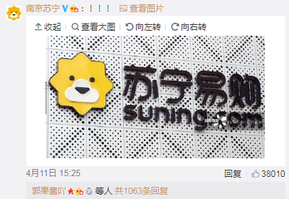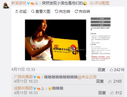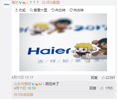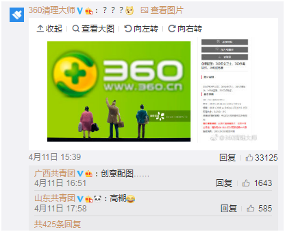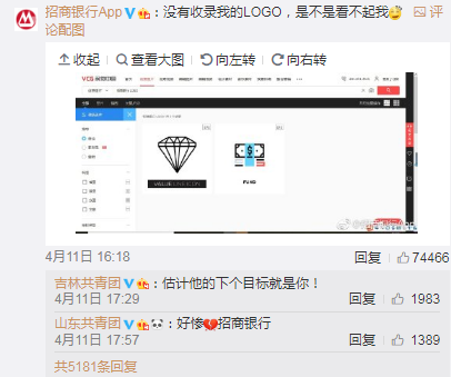 在@共青团中央点名的那条微博下面,各大品牌纷纷点名视觉中国。招商银行、南孚电池、凤凰网、苏宁、360、新浪、健力宝、茅台、海尔、小米、阿里,这些品牌的图片都有版权!