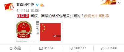 @共青团中央在15:05就视觉中国网站将国旗国徽用作付费使用一事表态:“国旗、国徽的版权也是贵公司的?”(wuli团团真是满满的讽刺语气啊)