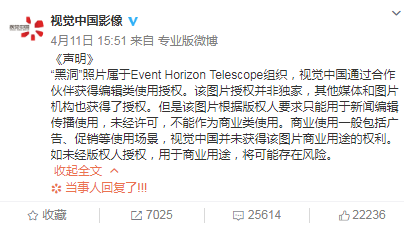 昨天下午15:51,视觉中国首次在微博回应,依然表示视觉中国网站的“黑洞”照片的授权来自Event Horizon Telescope组织,但是仅限于新闻报道,商用有风险。