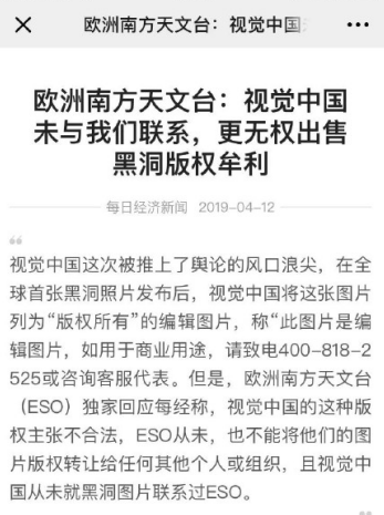 今早欧洲南方天文台声明,视觉中国从未曾与他们联系,也没有授权给他们版权,视觉中国更无权出售黑洞照片版权。这波打脸来得太快!