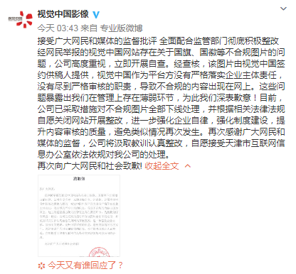 事情越演越烈,昨日晚18:26和今日凌晨03:43,@视觉中国在微博分别两次对网站关于国旗、国徽等不合规图片一事做出回应,分别附上了《致歉声明》和《致歉信》。在《致歉信》中表示:“根据相关法律法规自愿关闭网站开展整改”。