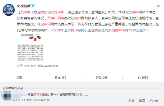 今天一大早,央视新闻发布:天津网信办连夜约谈视觉中国。enmmmm,这样看来,“关闭网站”是否自愿也是不得而知了。