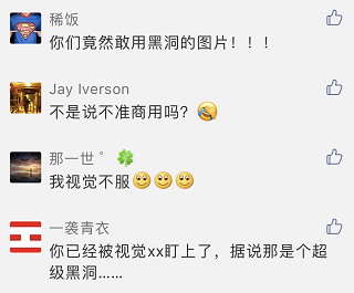 可是,昨晚6点梅小花推送完公众号后,后台留言就炸了,很多粉粉善意留言:黑洞的图是视觉中国的,自媒体不能用!!