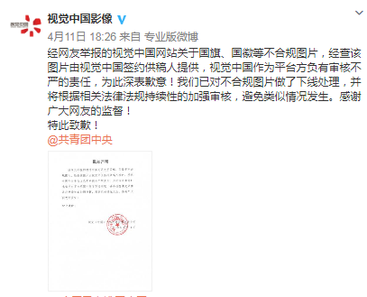 被@共青团中央点名的视觉中国,下午的时候终于出来回应了。