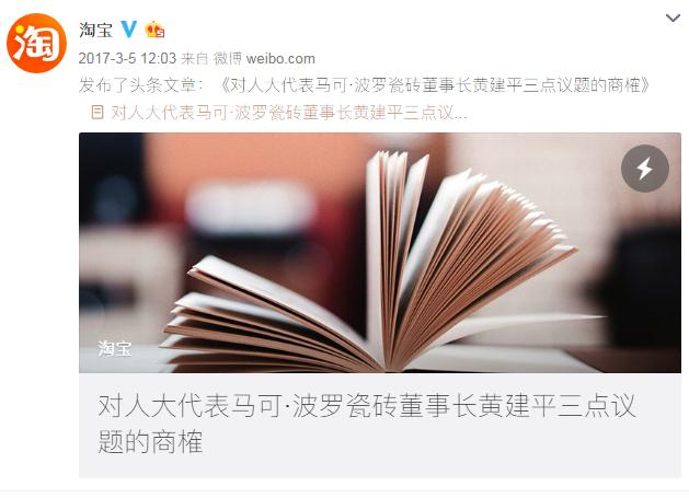 事件发生在两会时期,3.15前夕这种敏感时期,淘宝在处理上面稍有不慎则会严重影响企业的品牌形象。3月5日中午,淘宝在其官方微博、微信发文《对人大代表马可·波罗瓷砖董事长黄建平三点议题的商榷》作为回应。据统计,这边文章获得200万+的阅读量。以下是文章全部内容: