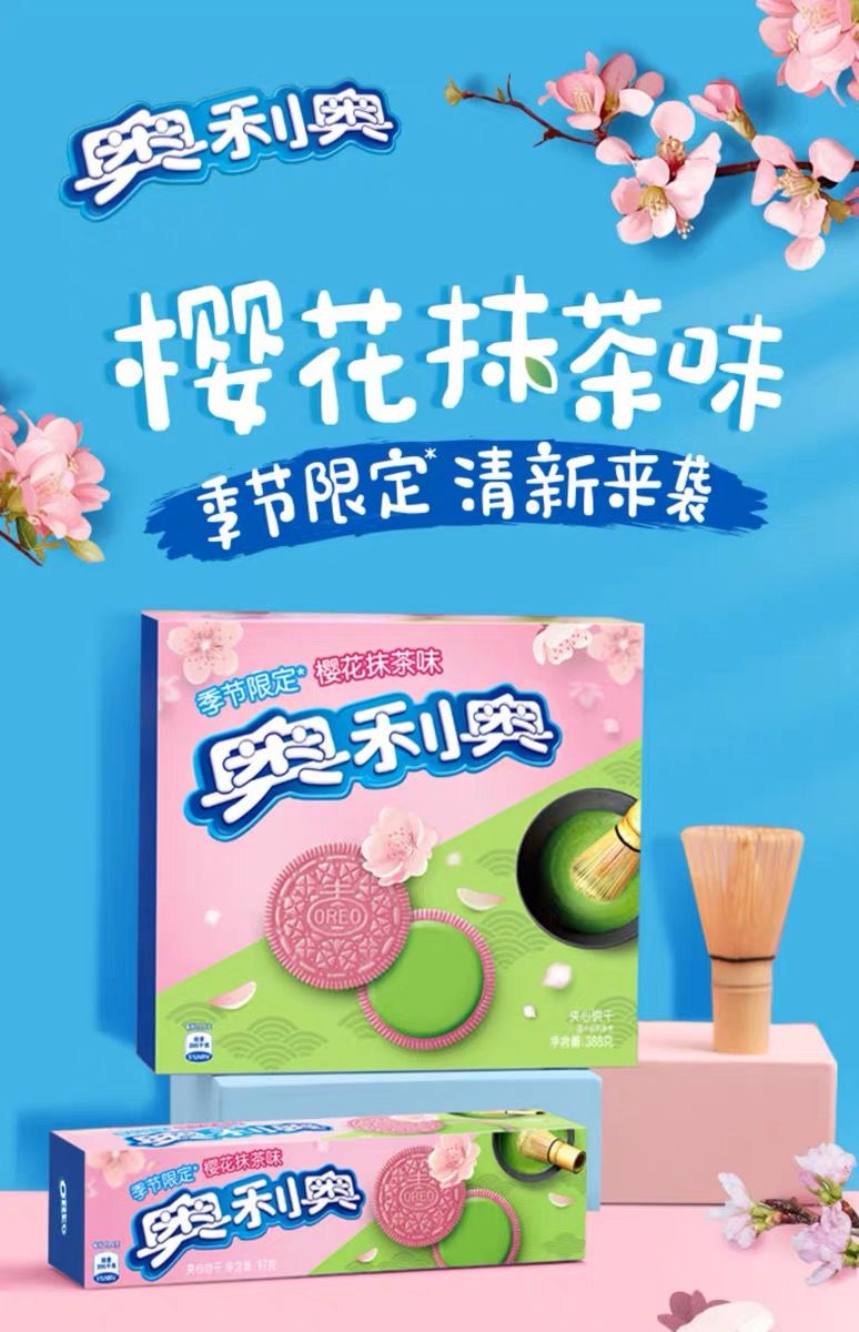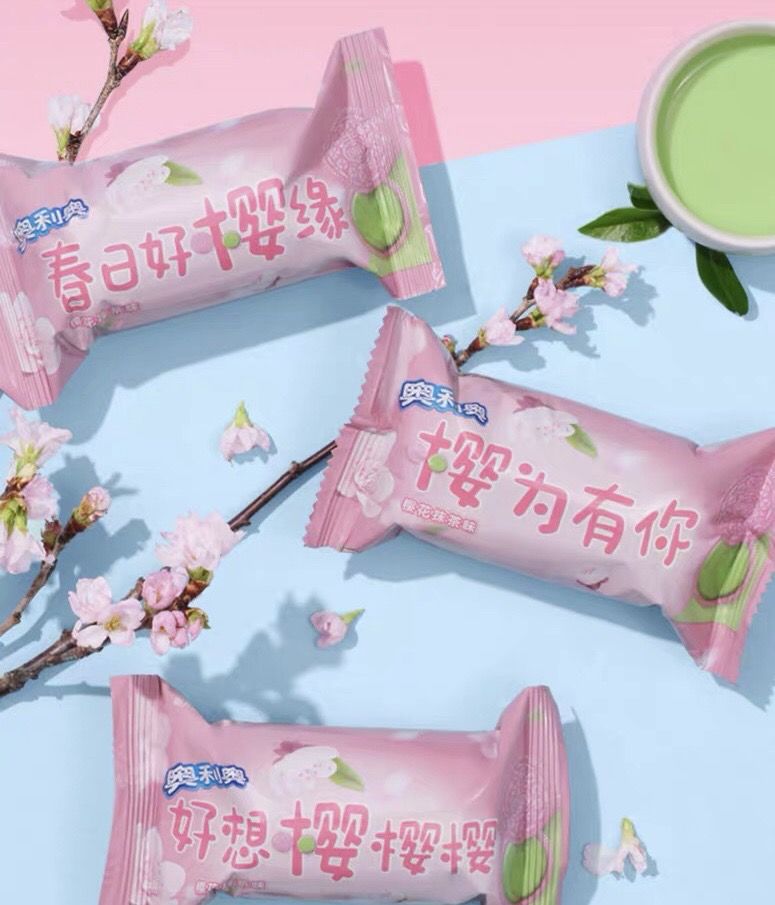 第一次变粉的奥利奥推出了季节限定「樱花抹茶味」,内部包装还有「樱」系列的可爱文案:樱为有你、春日好樱缘、好想樱樱樱…