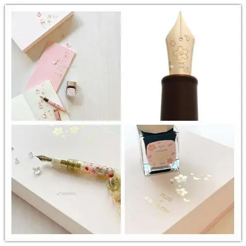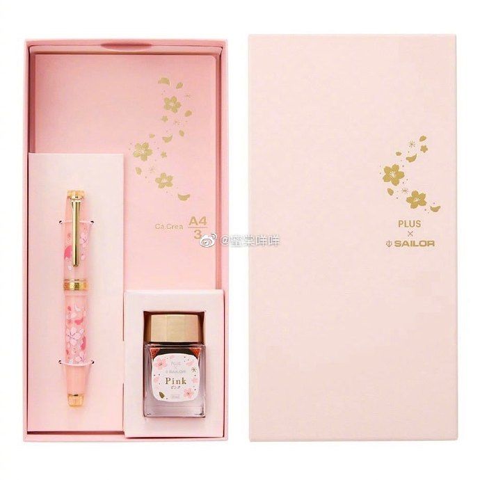 PLUS还和日本钢笔品牌SAILOR联名推出了樱花季限定钢笔系列,内含笔记本、钢笔、墨水等组合产品,连钢笔笔尖都是精致的樱花雕刻工艺,梅小花想去学习了~
