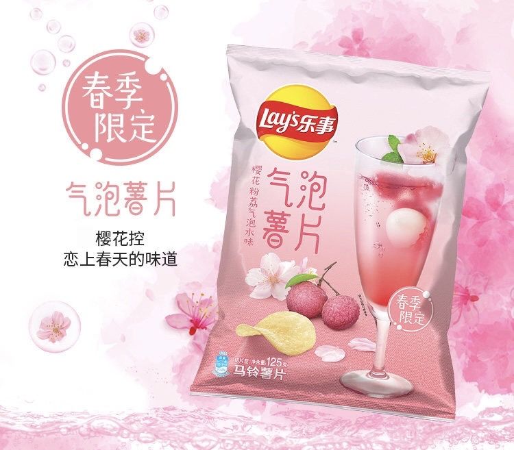 乐事春季限定气泡薯片「樱花粉荔枝泡水味」让春天在嘴巴里冒个泡。