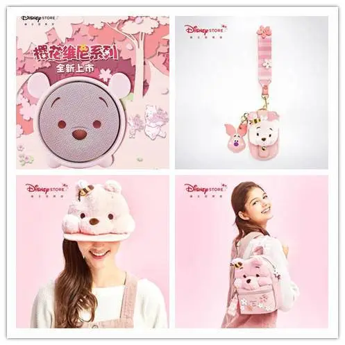 迪士尼则在国推内出了樱花维尼系列,包括:毛绒玩具、蓝牙音箱、斜挎包、双肩包、帽子、卡包等。