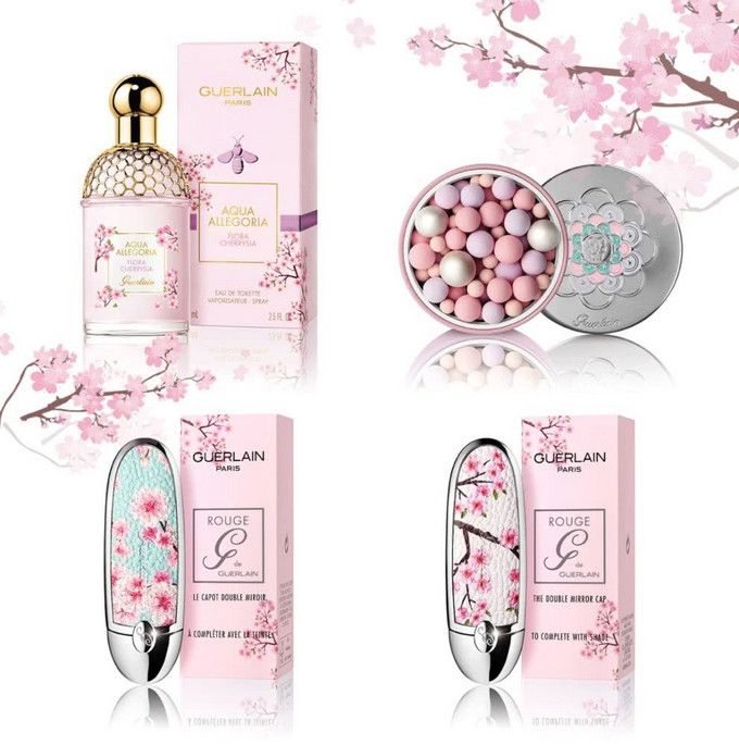 娇兰2020樱花限定产品包含一款樱花香调的淡香水、樱花配色的幻彩流星蜜粉以及两款限定臻彩宝石唇膏外壳和膏体。