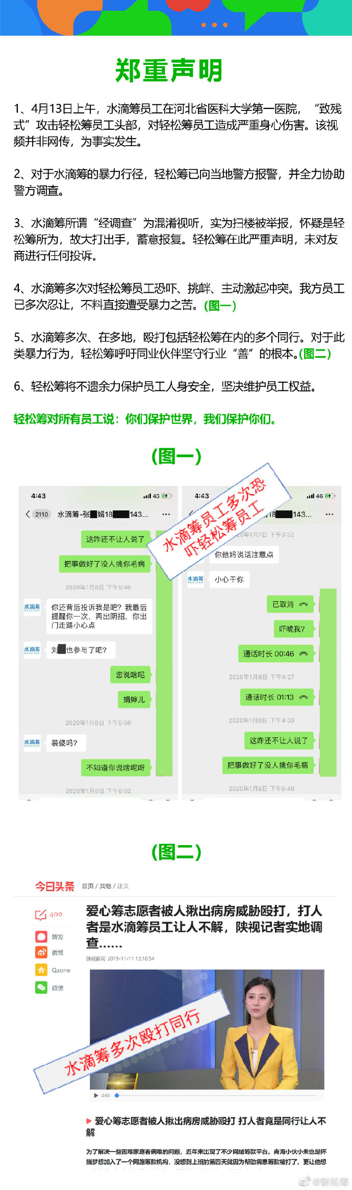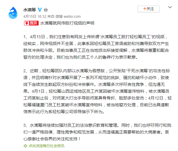 1、4月15日,我们注意到有网友上传所谓“水滴筹员工殴打轻松筹员工”的视频,经核实,网传视频并不全面,此事系因轻松筹员工言语威胁和污蔑导致双方产生肢体冲突和斗殴。目前当事员工正在当地派出所接受调解,水滴筹将尊重和配合警方的处理决定,我们也为我们员工个人的鲁莽行为表示歉意。