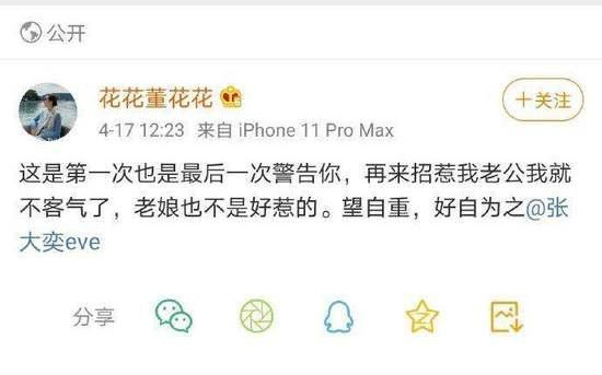 4月17日中午,一位名为“花花董花花”的微博号@张大奕,称“这是我最后一次警告你,再来招惹我老公我就不客气了,老娘也不是好惹的,望自重,好自为之。”随后,有网友扒出“花花董花花”的老公疑似淘宝总裁兼天猫总裁蒋凡。