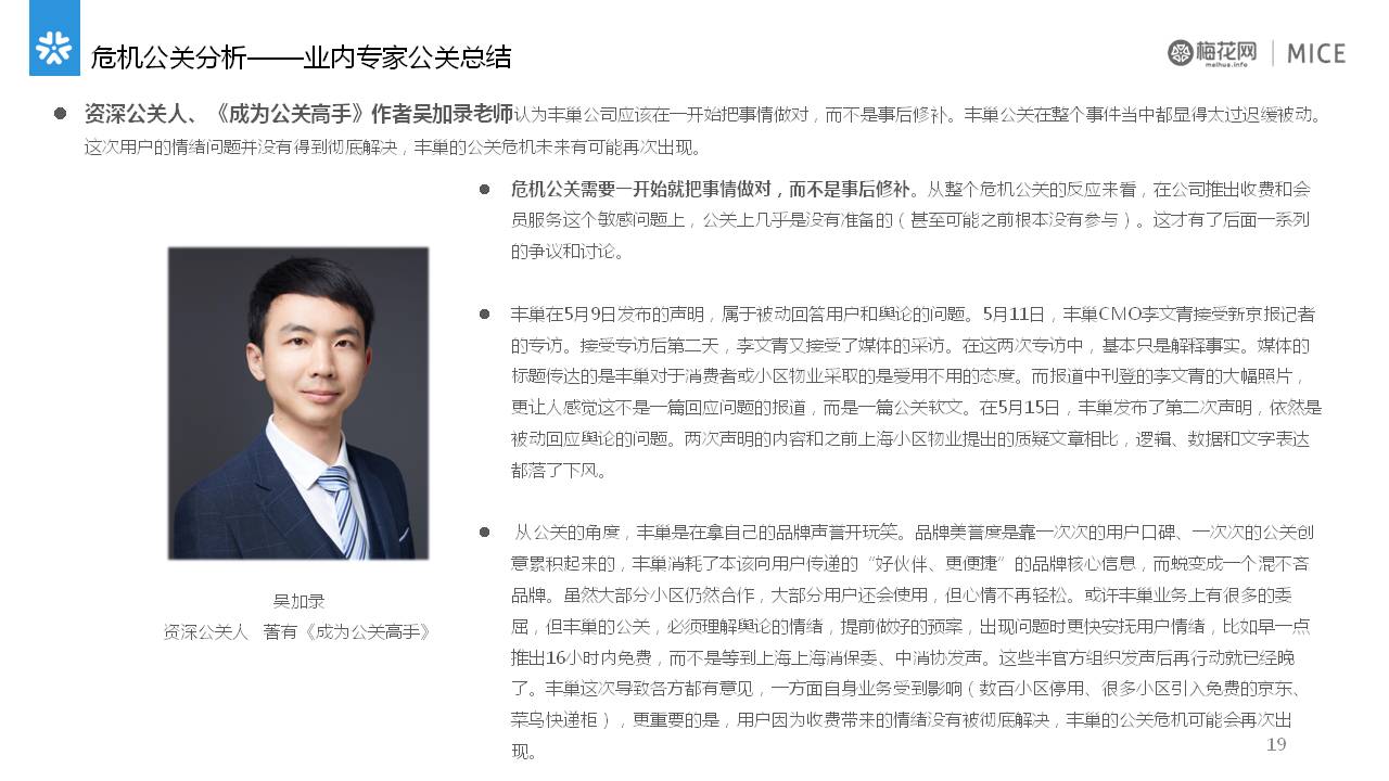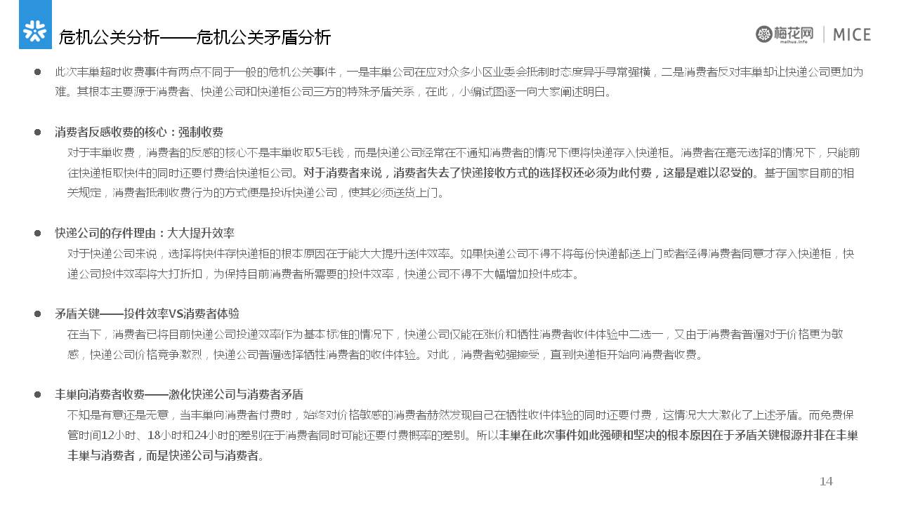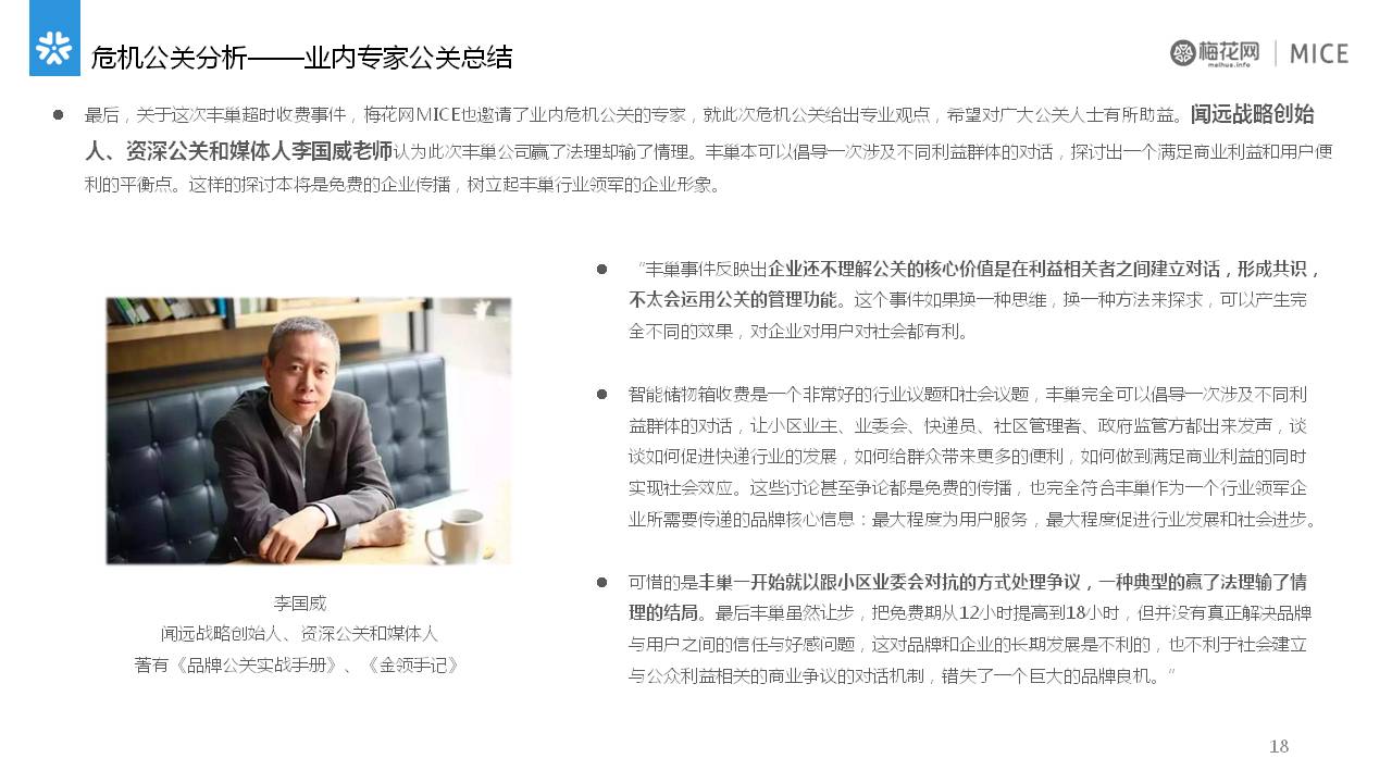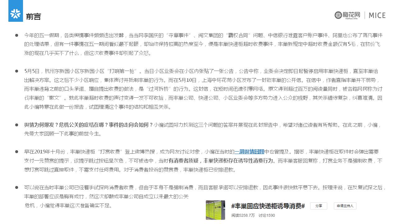 自五一假期结束,丰巢超时收费事件引发相当的社会反响,用户、媒体、有关部门纷纷参与其中,直至目前仍有影响。梅花网此次制作了这份危机公关报告,并有幸邀请到业内公关专家作出专业点评,希望能为广大公关从业人员有所帮助。