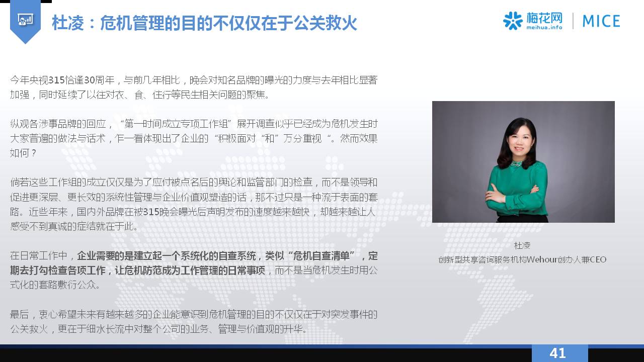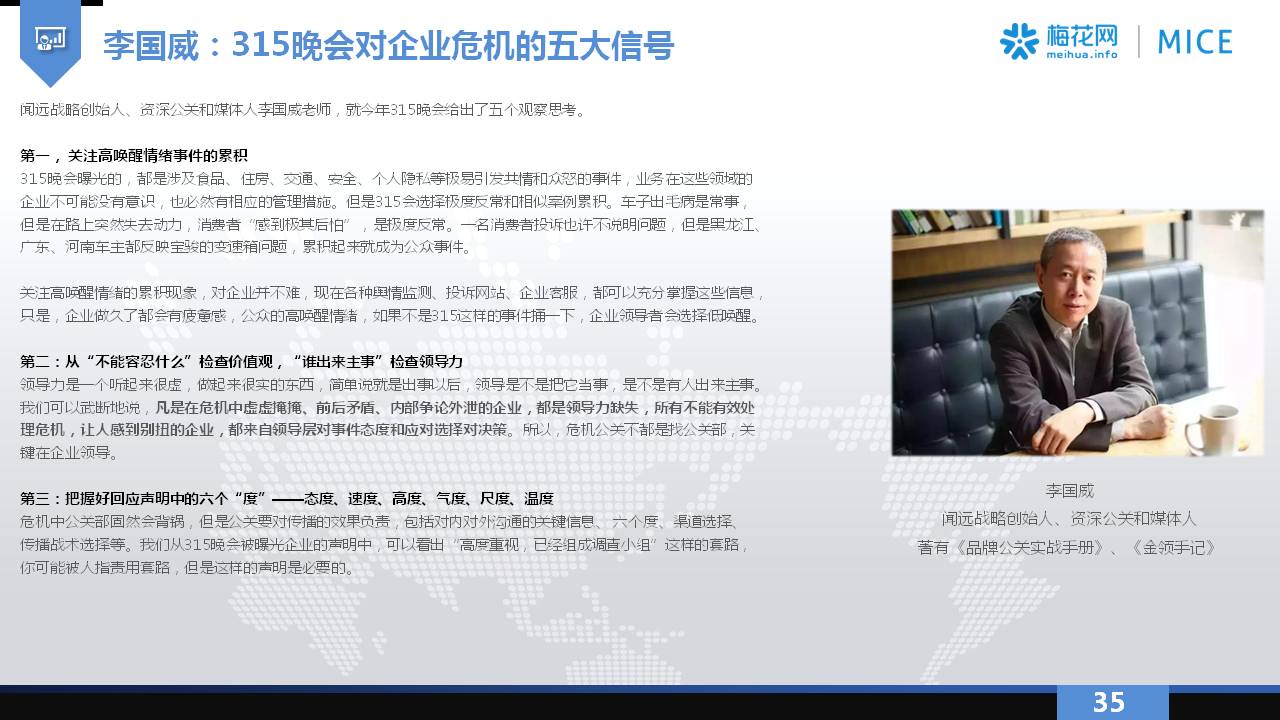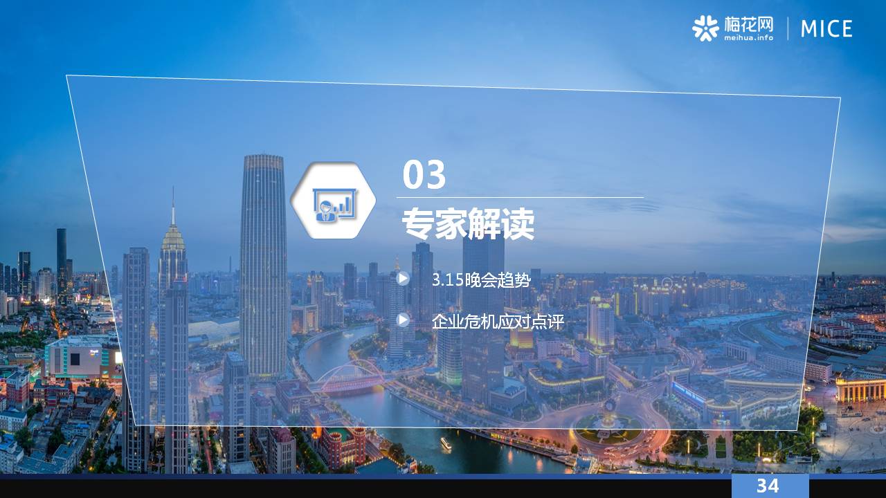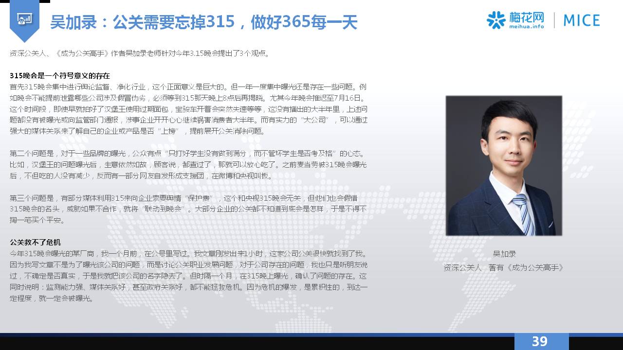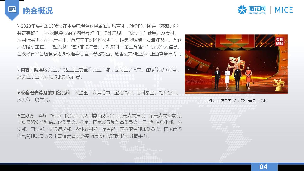 梅花网根据旗下MICE舆情监测系统,制作了《梅花网MICE3.15晚会案例总结报告》,对晚会报告的各案例进行事件解析、公关分析和舆情分析,同时梅花网还邀请了多位公关专家针对今年3.15晚会给出其独到的见解。