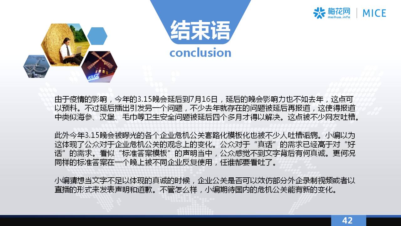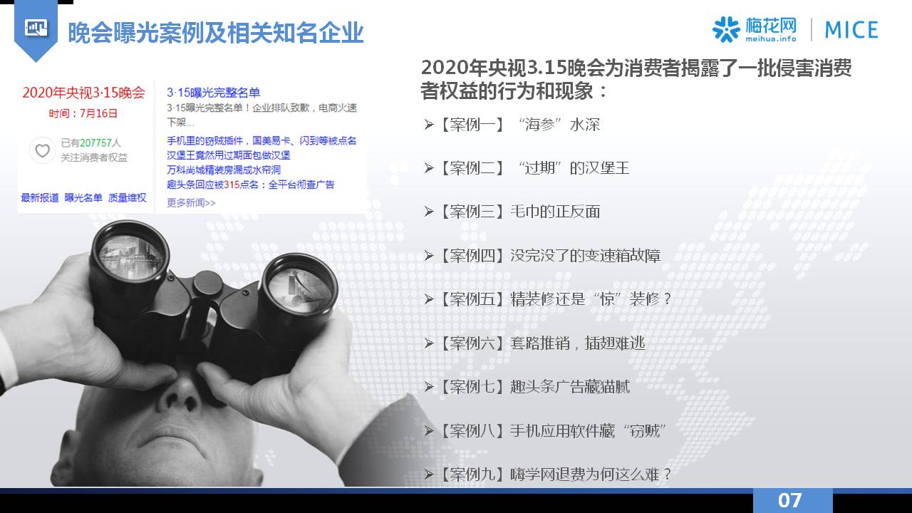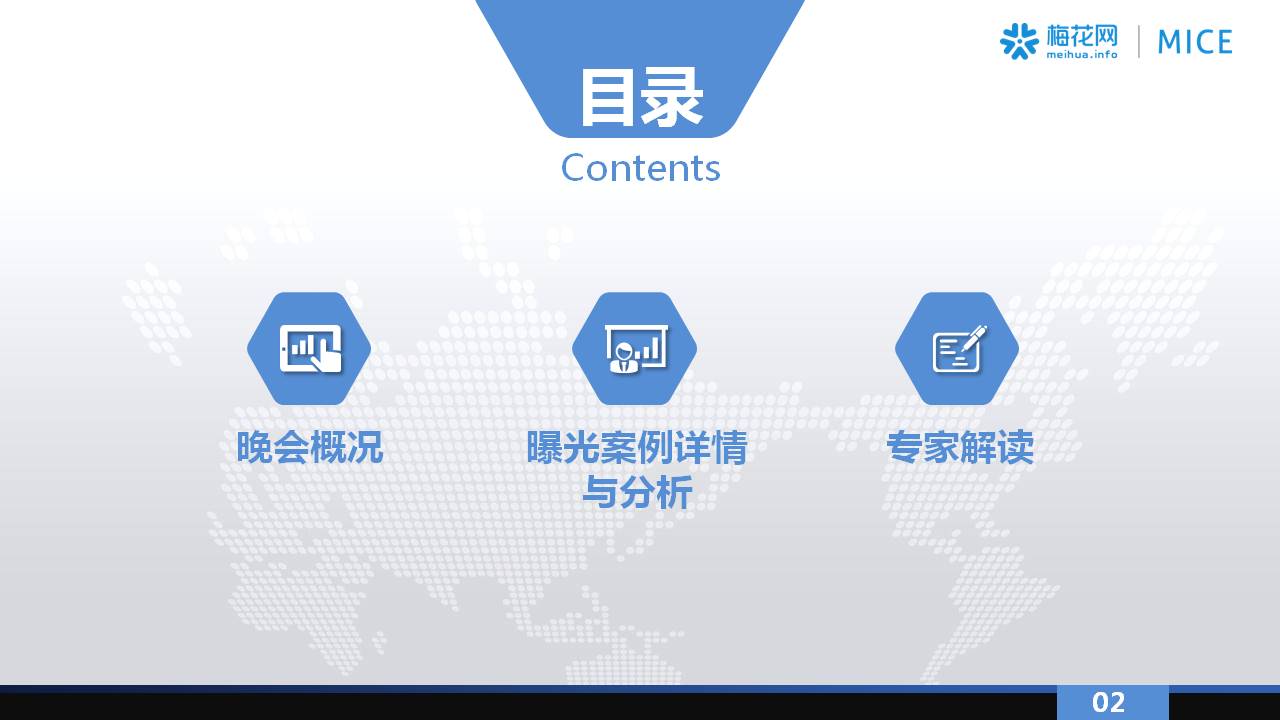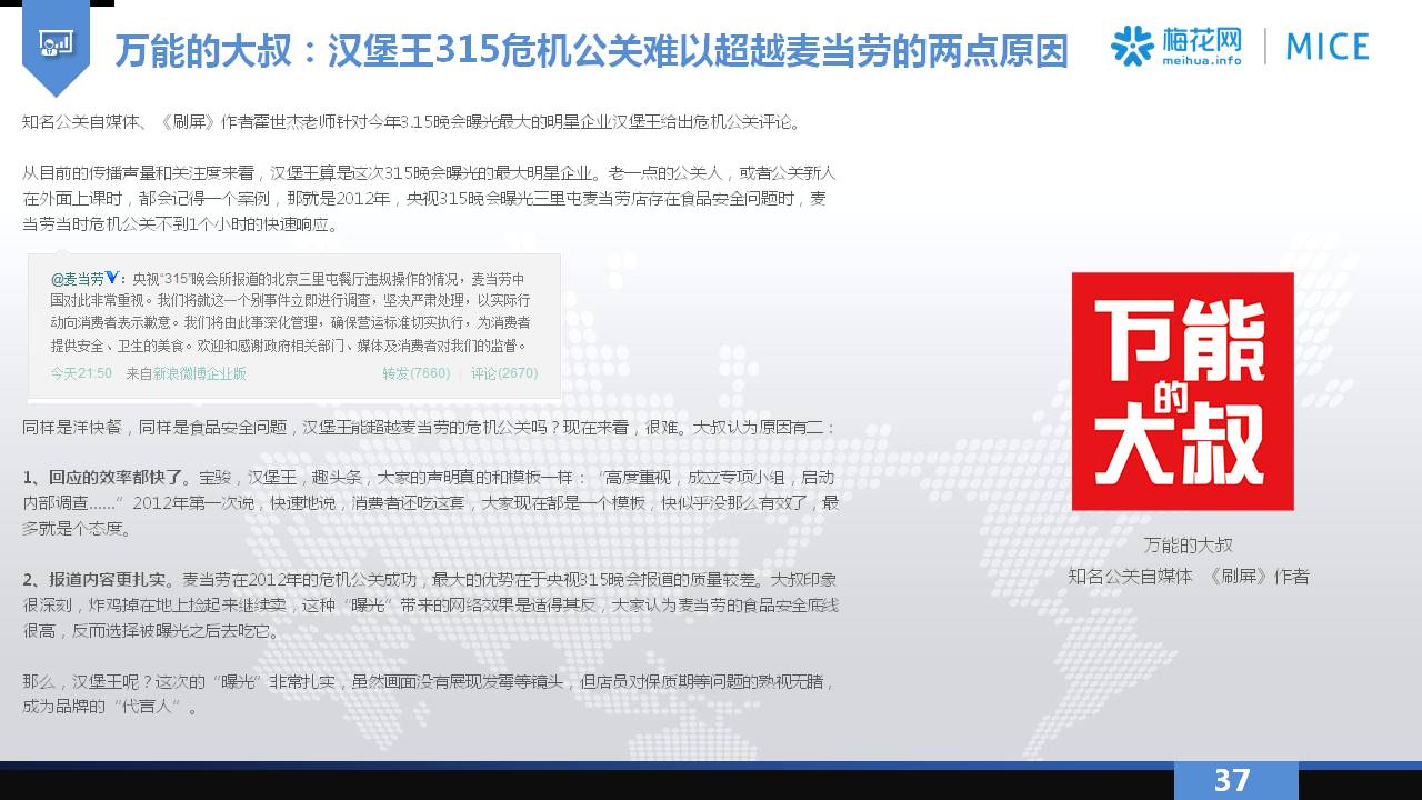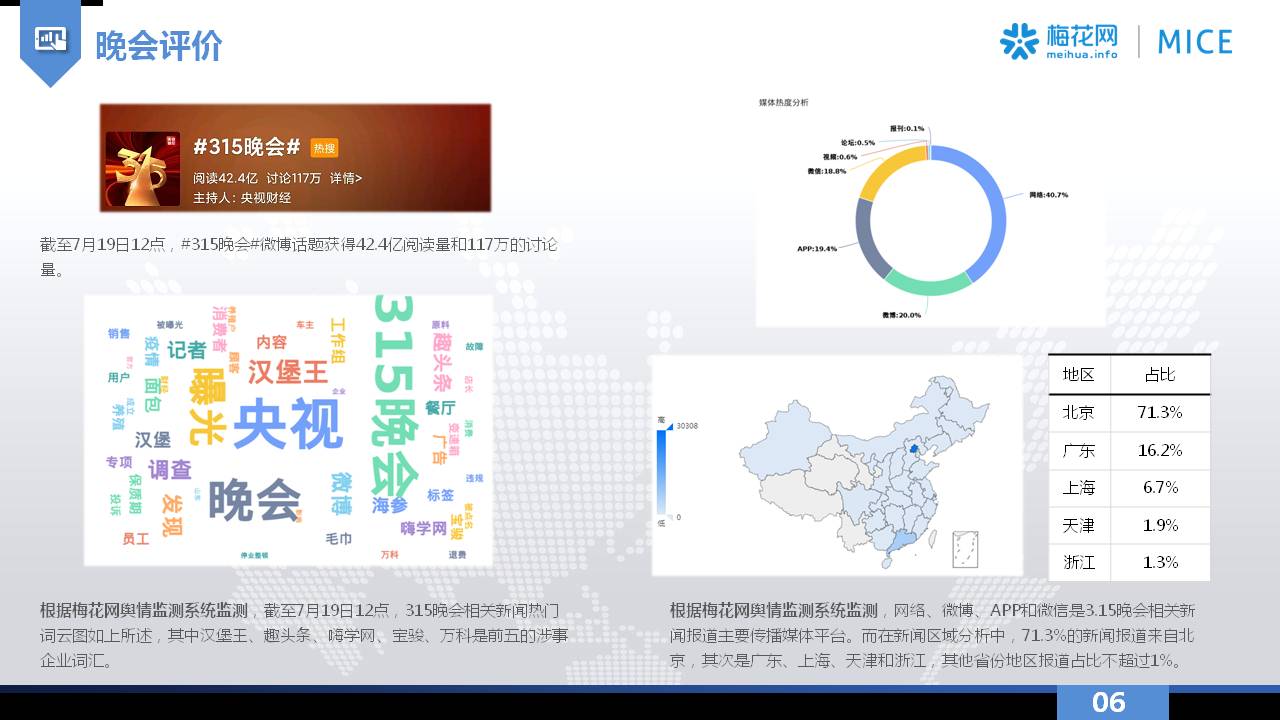 梅花网根据旗下MICE舆情监测系统,制作了《梅花网MICE3.15晚会案例总结报告》,对晚会报告的各案例进行事件解析、公关分析和舆情分析,同时梅花网还邀请了多位公关专家针对今年3.15晚会给出其独到的见解。