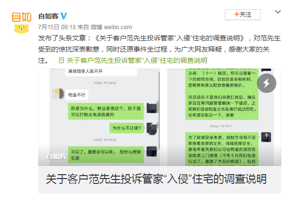 针对不久前独立开发者“DIYgod”爆料自如管家擅闯房间拍照的事件,自如今天发布调查说明。