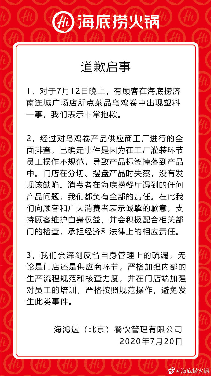 7月20日晚,海底捞官方微博就此事道歉。海底捞表示,门店于当日接到反馈便对该产品的供应商生产加工、门店配餐等过程进行全面排查,对供应商生产加工环节派食安人员到现场进行核查。经过排查,该事件原因已确定为工厂灌装环节员工操作不规范,导致产品标签掉落到产品中。