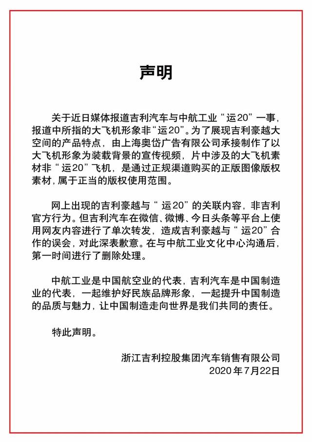 吉利汽车表示,网上出现的吉利豪越与“运20”的关联内容,非吉利官方行为。但吉利汽车在微信、微博、今日头条等平台上使用网友内容进行了单次转发,造成吉利豪越与“运20”合作的误会,对此深表歉意。在与中航工业文化中心(以下简称“中航工业”)沟通后第一时间进行了删除处理。