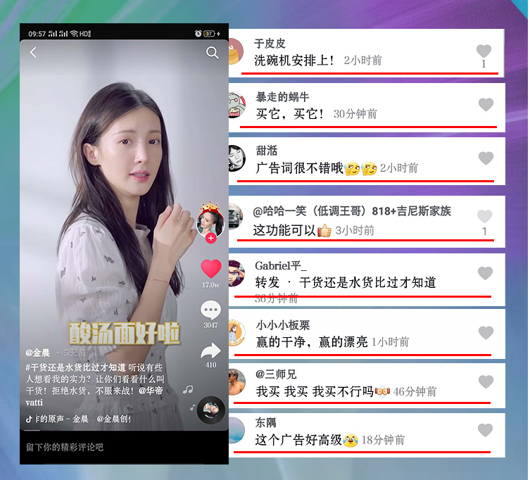7月23日17点,金晨率先发布抖音短视频。在短视频中,金晨以亲切甜美的家居形象出现,以姐姐们的餐饮日常入手,代入家庭生活日常情境,展示了传统洗碗机洗后餐具潮湿、滋生霉菌等常见困扰,极易引发共鸣,而后对华帝干态洗碗机的智能操控及洗碗效果干净不潮的简短展示,突出了华帝干态洗碗机的核心竞争卖点。一个飒气的“钝角一字马”,伴随攻气十足的竞技宣言“干货还是水货比过才知道”,让人心头振奋印象深刻。
