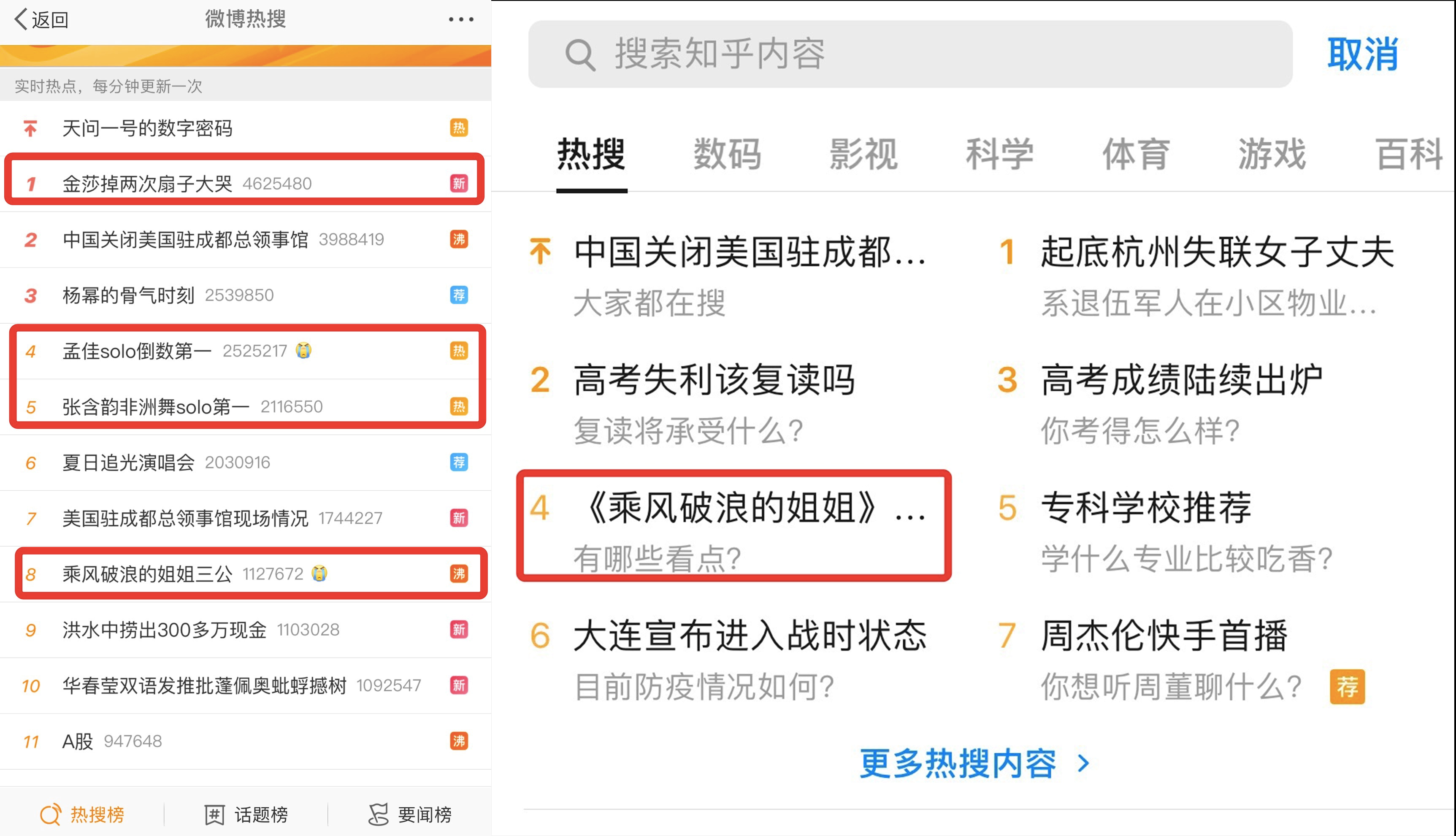 《乘风破浪的姐姐》在微博及知乎热搜榜上