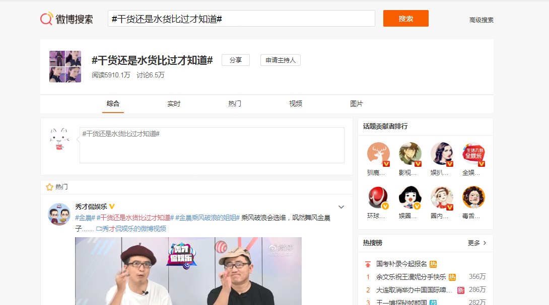 7月23日下午17点,华帝公司和金晨在微博和抖音同时发出联动,一句“干货还是水货比过才知道”引爆全网,将近期大热的“乘风破浪的姐姐”金晨再次推上话题,也将华帝干态洗碗机传到大众视野。
