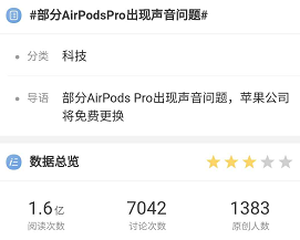 截至到11月2日中午,#部分AirPodsPro出现声音问题#的热搜拥有1.6亿次阅读数。