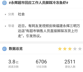 截至到11月2日中午,#永辉超市回应工作人员脚踩冷冻鱼虾#热搜拥有3.8亿次阅读数。此外,从新闻评论区里看到,大部分网友对永辉超市的回应并不认可,不少人怀疑是否真的进行下架销毁处理。