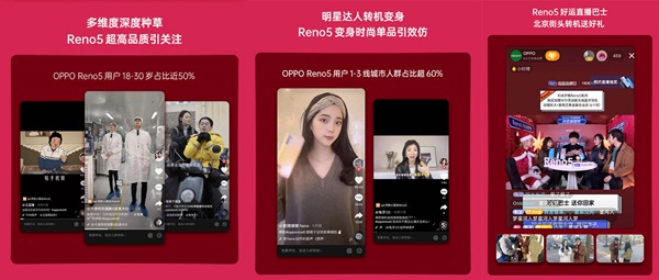 OPPO将Reno5新品上市营销项目落地抖音,结合抖音属性,从预热种草、造势蓄水、直播电商、创意大事件多个维度完成独立于内容平台的整合营销项目。