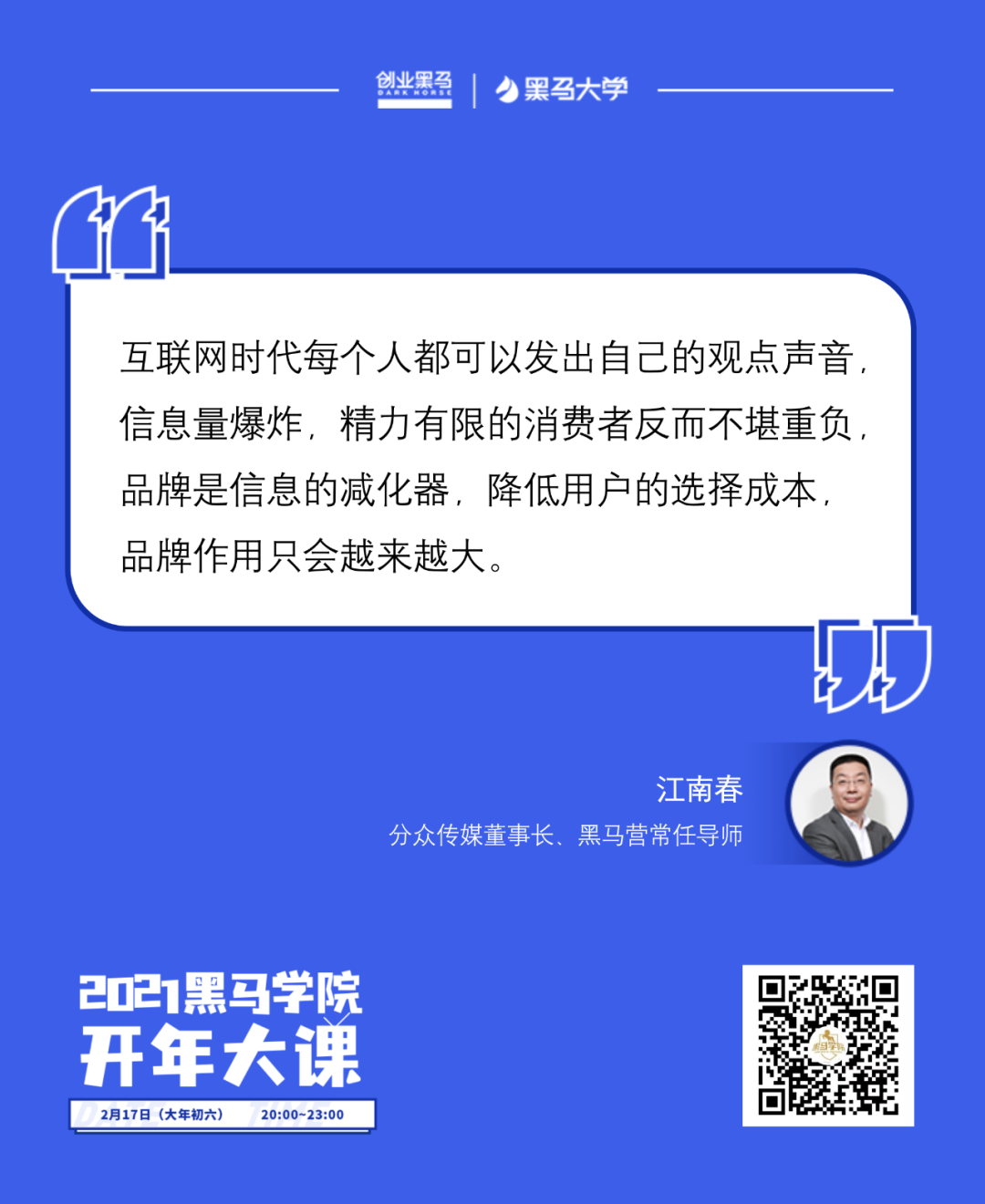 互联网从图文到视频到直播,创造了即时海量信息,信息越来越丰富了。但是品牌和顾客沟通效率是不是越来越高了呢?正好相反。消费者的选择更加依赖品牌。因为信息越来越丰富,传播渠道越来越发展,互联网上每个人都可以发出自己的声音,信息量爆炸的时候,精力有限的消费者反而不堪重负。品牌是信息的减化器,消费者可以通过品牌做信息减化,降低自己的选择成本,品牌的作用只会越来越大。