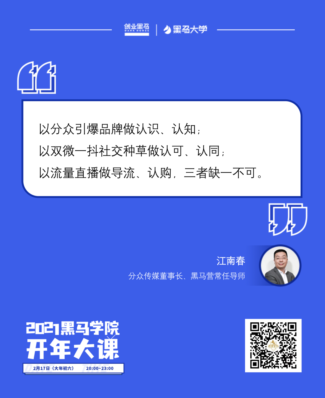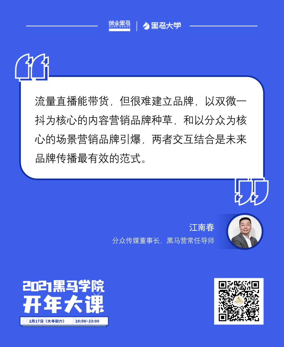 2021年2月17日(大年初六)20:00,“2021黑马学院开年大课”线上开讲。牛文文、江南春、李丰、陈俊、李祝捷、吴世春、刘纲7位黑马导师通过黑马大学APP、创业黑马学院视频号、抖音号,联合新浪财经、百度、搜狐科技等平台,面向广大创业者进行了长达四个多小时的“开年第一讲”。