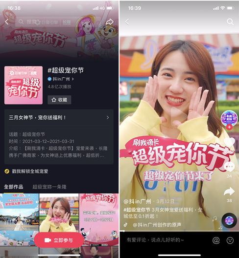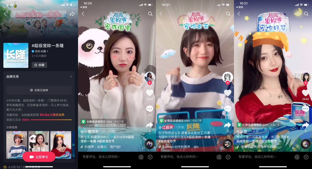 宠爱巨献不止于此,活动总冠商长隆进一步为女神们打造“升宠之礼”,在抖音平台发起"超级宠妳一条隆"抖音全民任务挑战,结合创意品牌变装贴纸让女神们尽情"云"感受可爱的熊猫抱、刺激的过山车还有舒适的长隆酒店,吸引粉丝们瓜分千万流量。截止3月28日,话题共收获超过3亿次播放,并获得8.7万次参与的现象级传播。