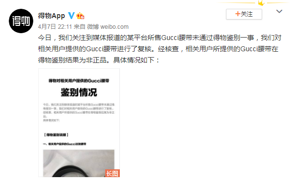 而当天晚上22点11分,得物官方微博也正式回应表示:今日,我们关注到媒体报道的某平台所售Gucci腰带未通过得物鉴别一事,我们对相关用户提供的Gucci腰带进行了复核。经核查,相关用户所提供的Gucci腰带在得物鉴别结果为非正品。