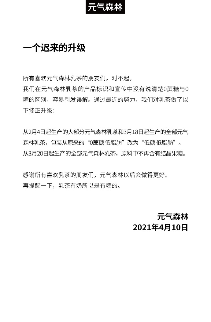 4月10日,元气森林发布致歉声明称,元气森林此前在乳茶产品的产品标示和宣传中,没有说明“0糖”和“0蔗糖”的区别,容易引发误解。元气森林在其官方微博发布《一个迟来的升级》的公告,对未说清楚“0蔗糖”与“0糖”一事道歉。