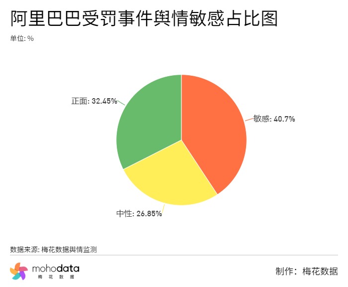 监测期内,梅花数据舆情监测获得的舆情敏感占比图如下所示。值得一提的是,这次事件中正面占比达到32.45%,主要因为市场对于此次事件的解读比较乐观,处罚后的第一个交易日,阿里巴巴股票也获得大涨。