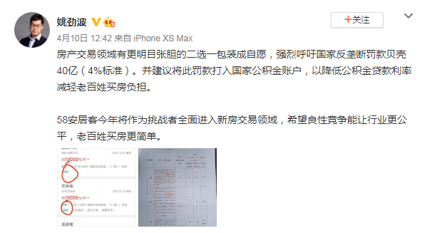 4月10日,58同城集团CEO、安居客董事会主席姚劲波在微博发文称,在房产交易领域存在“二选一”行为。