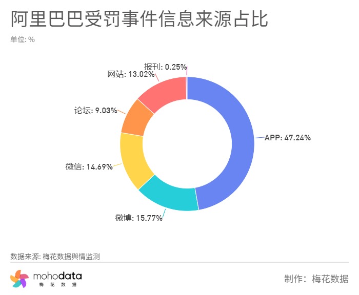 据梅花数据舆情监测所得,以“阿里巴巴+处罚”为关键词,时间范围选自4月10日0点至4月12日13点整,监测总声量为86719条。该事件信息来源占比如下图所示: