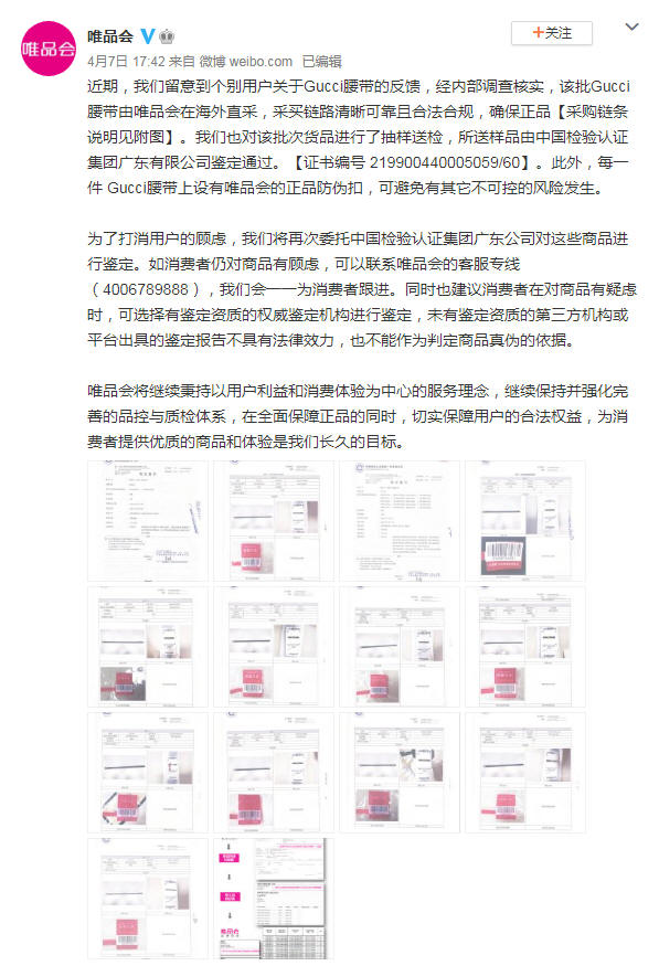 4月7日17点42分,唯品会微博正式回应:唯品会近期,我们留意到个别用户关于Gucci腰带的反馈,经内部调查核实,该批Gucci腰带由唯品会在海外直采,采买链路清晰可靠且合法合规,确保正品【采购链条说明见附图】。我们也对该批次货品进行了抽样送检,所送样品由中国检验认证集团广东有限公司鉴定通过。【证书编号 219900440005059/60】。此外,每一件 Gucci腰带上设有唯品会的正品防伪扣,可避免有其它不可控的风险发生。