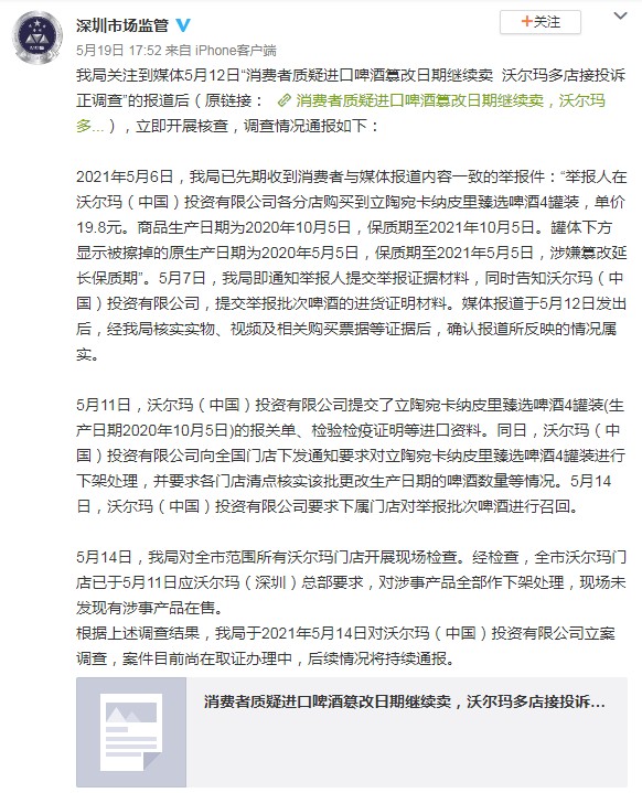 5月14日,沃尔玛中国要求下属门店对举报批次啤酒进行召回。同日,深圳市监局对全市范围所有沃尔玛门店开展现场检查,经查,全市沃尔玛门店已于5 月11日应沃尔玛(深圳)总部要求,对涉事产品全部作下架处理。