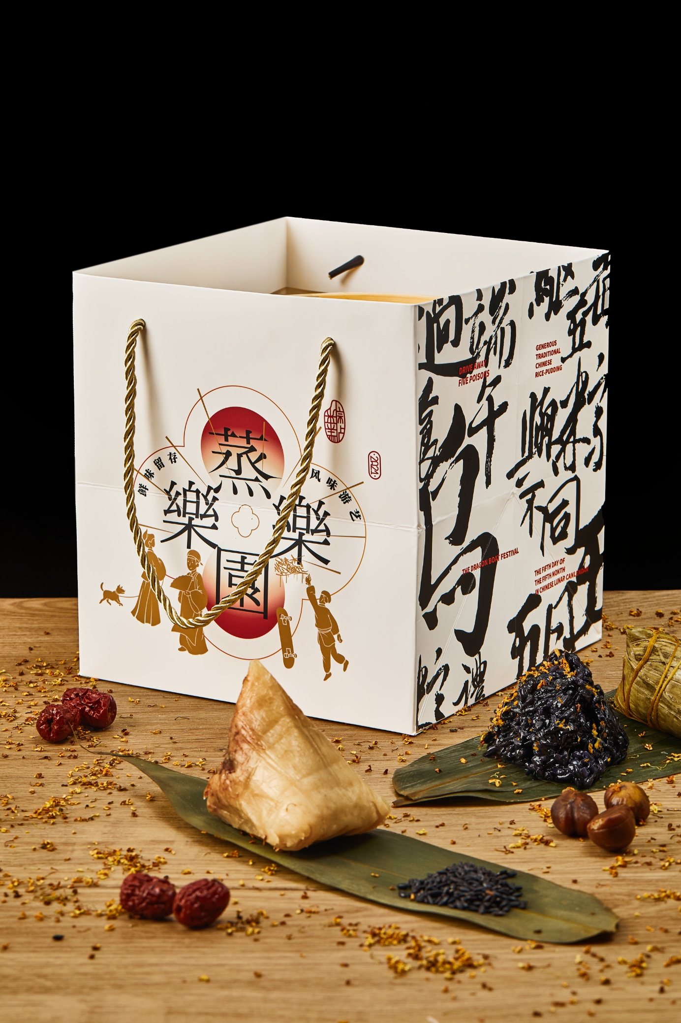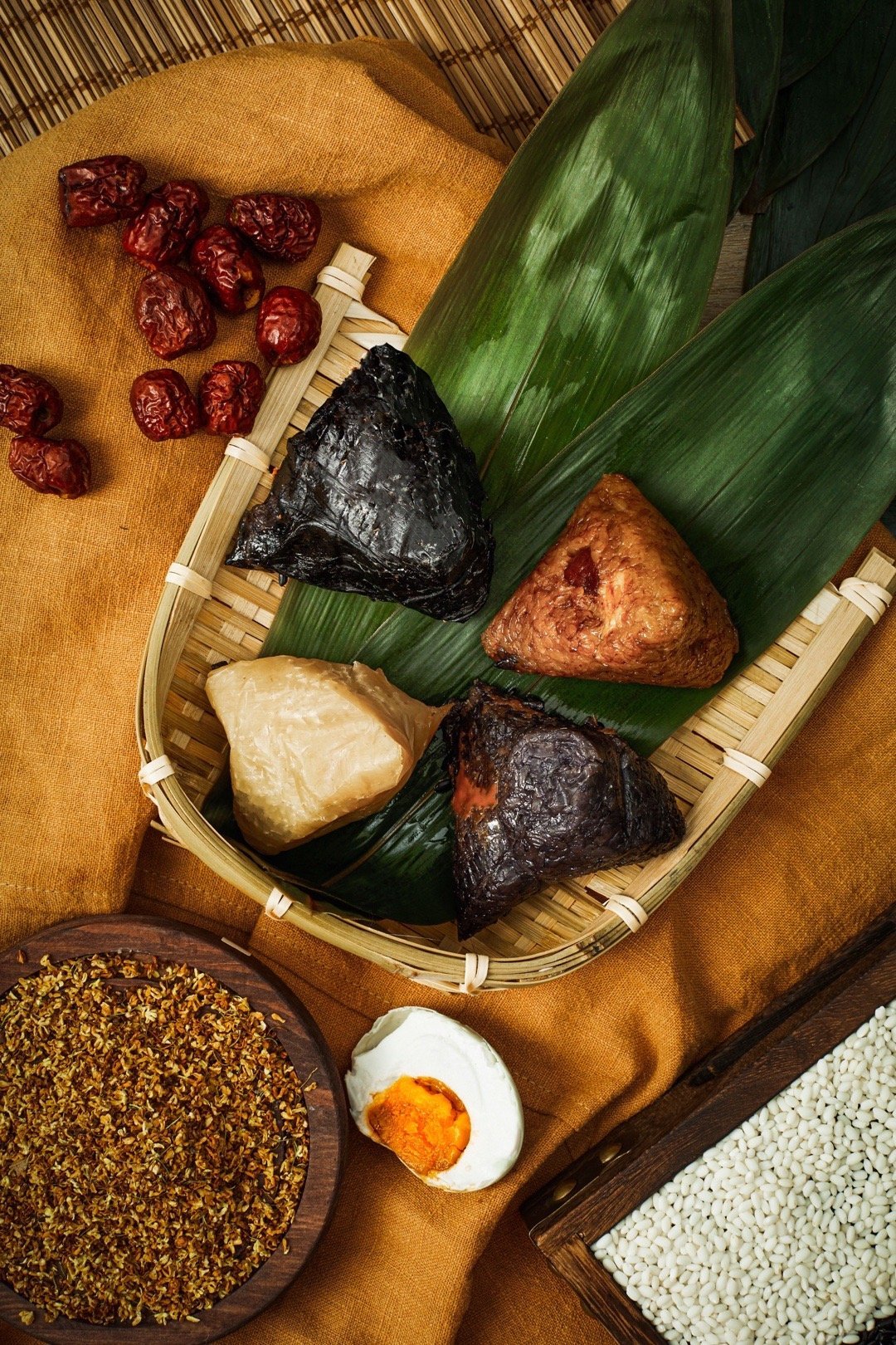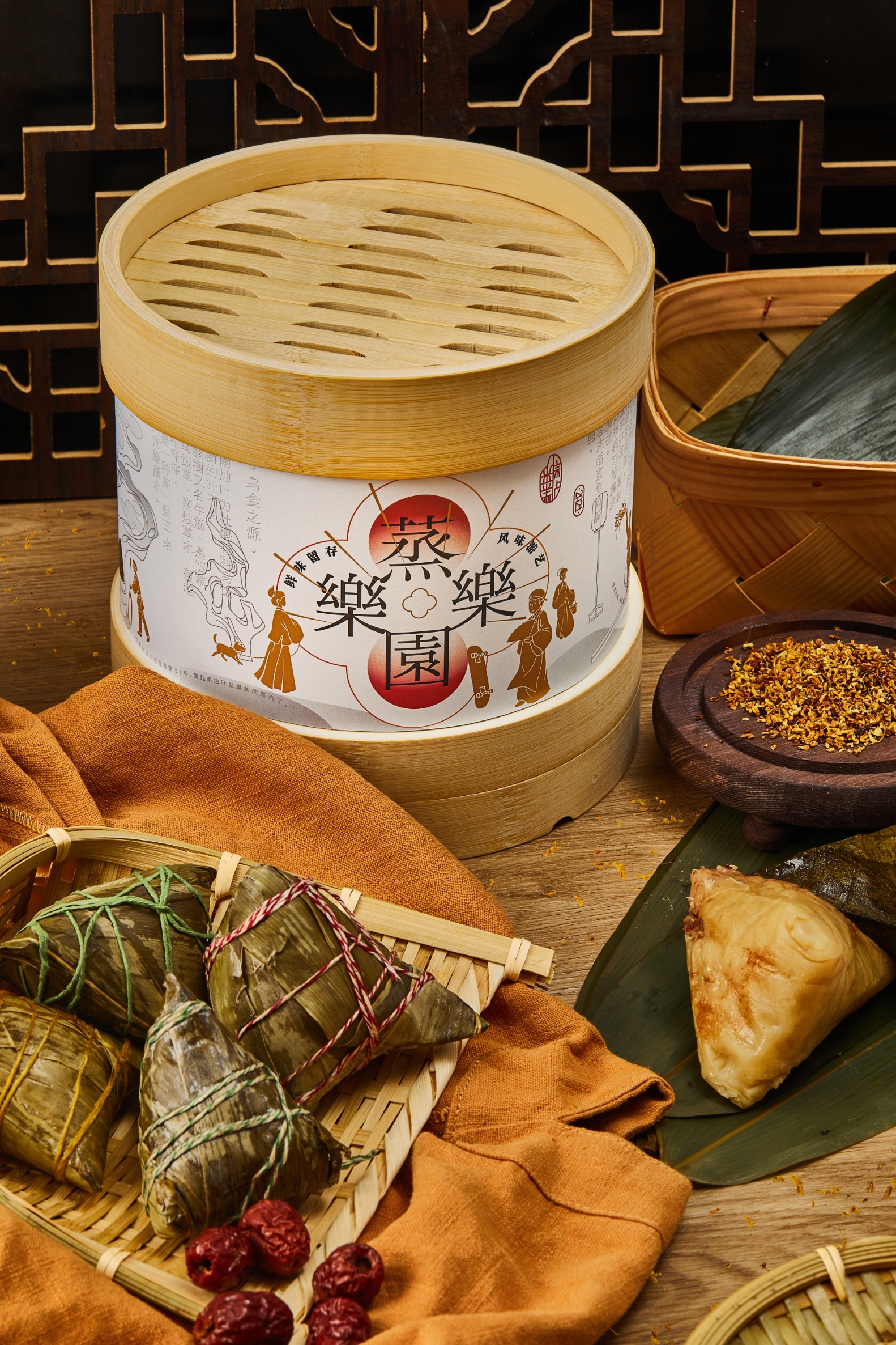 蒸笼中包含四种口味,除经典蛋黄肉粽外,还有洗沙桂花乌米粽、板栗鲜肉乌米粽、香甜蜜枣白雪粽。