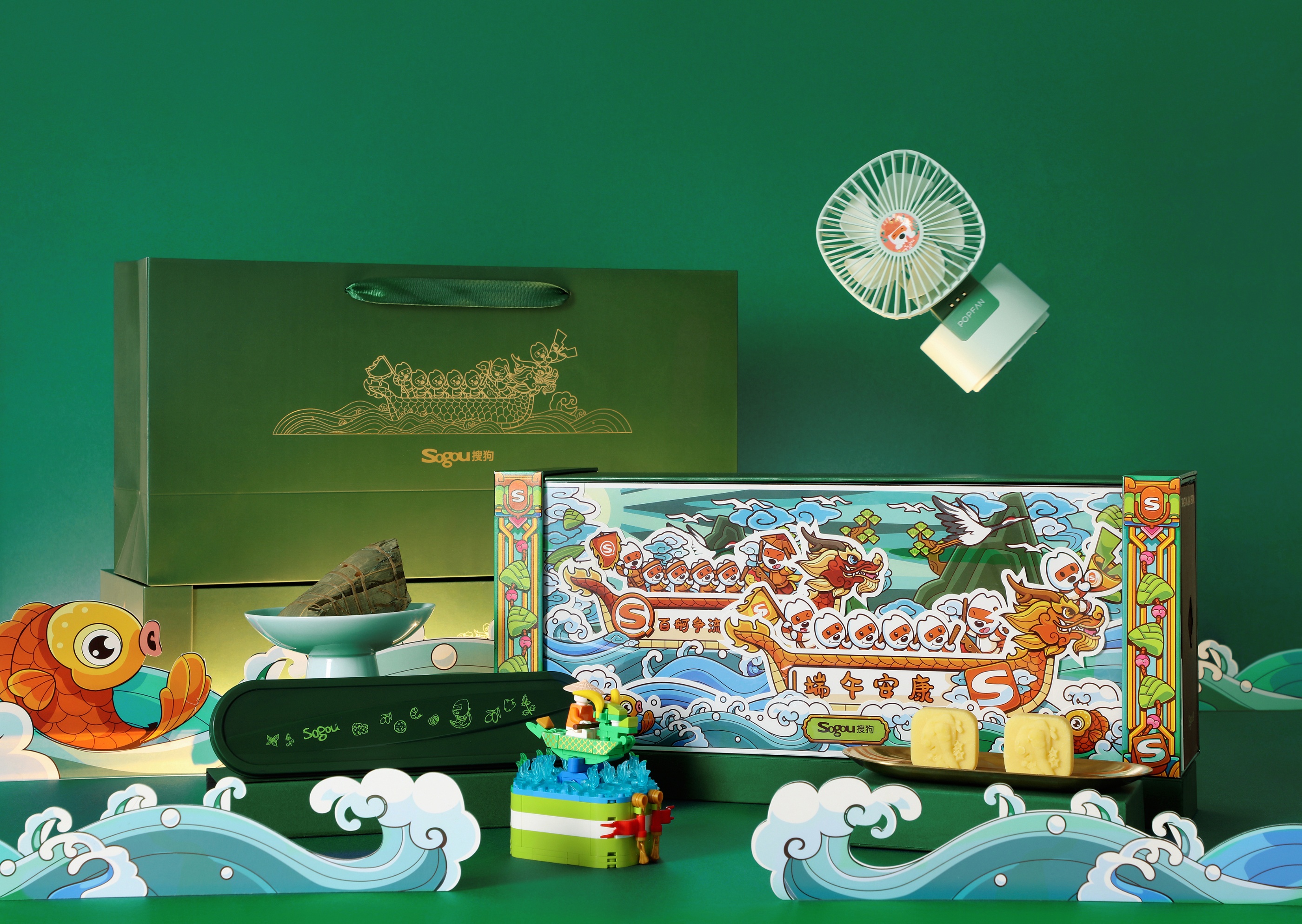 龙舟设计,实则将公司核心产品输入法和搜狗搜索功能点拟物化,营造热闹的你追我赶节日比赛场景。