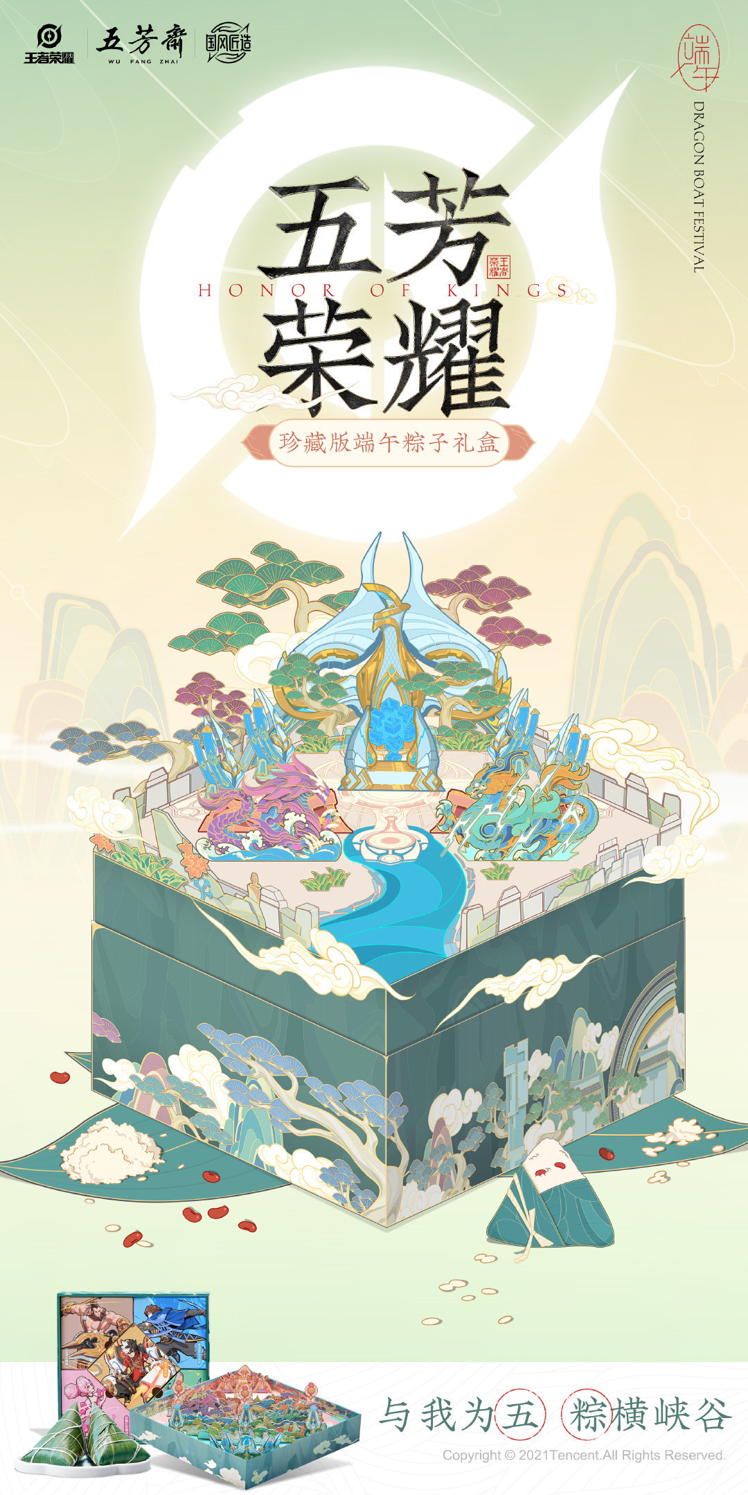 很会联名的王者荣耀这次携手五芳斋推出了一款珍藏版端午节粽子礼盒,霸气取名“五芳荣耀”。其广告语再次玩转谐音梗——#与我为五,粽情峡谷#。