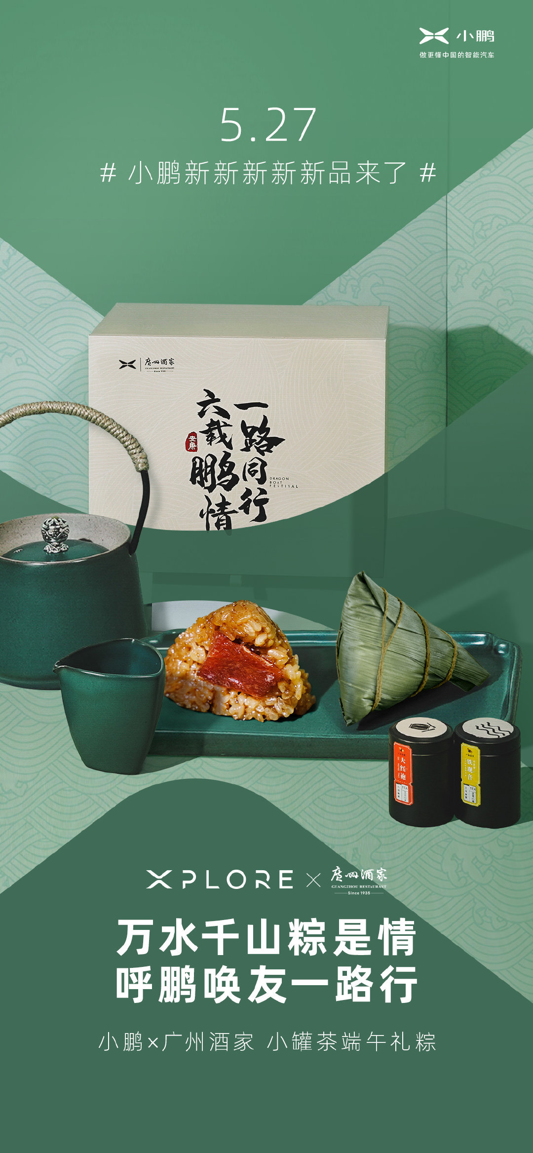 新能源车品牌小鹏汽车联手“食在广州第一家”广州酒家集团为鹏友定制了一款新品礼盒,包含两种传统口味的粽子和一份实用又好看的茶具。