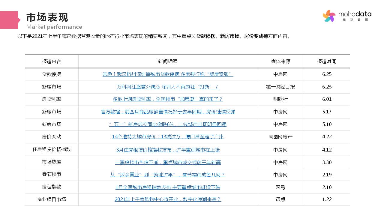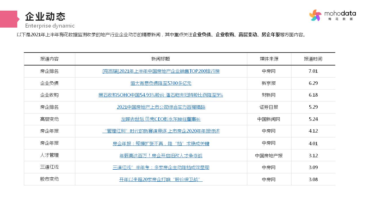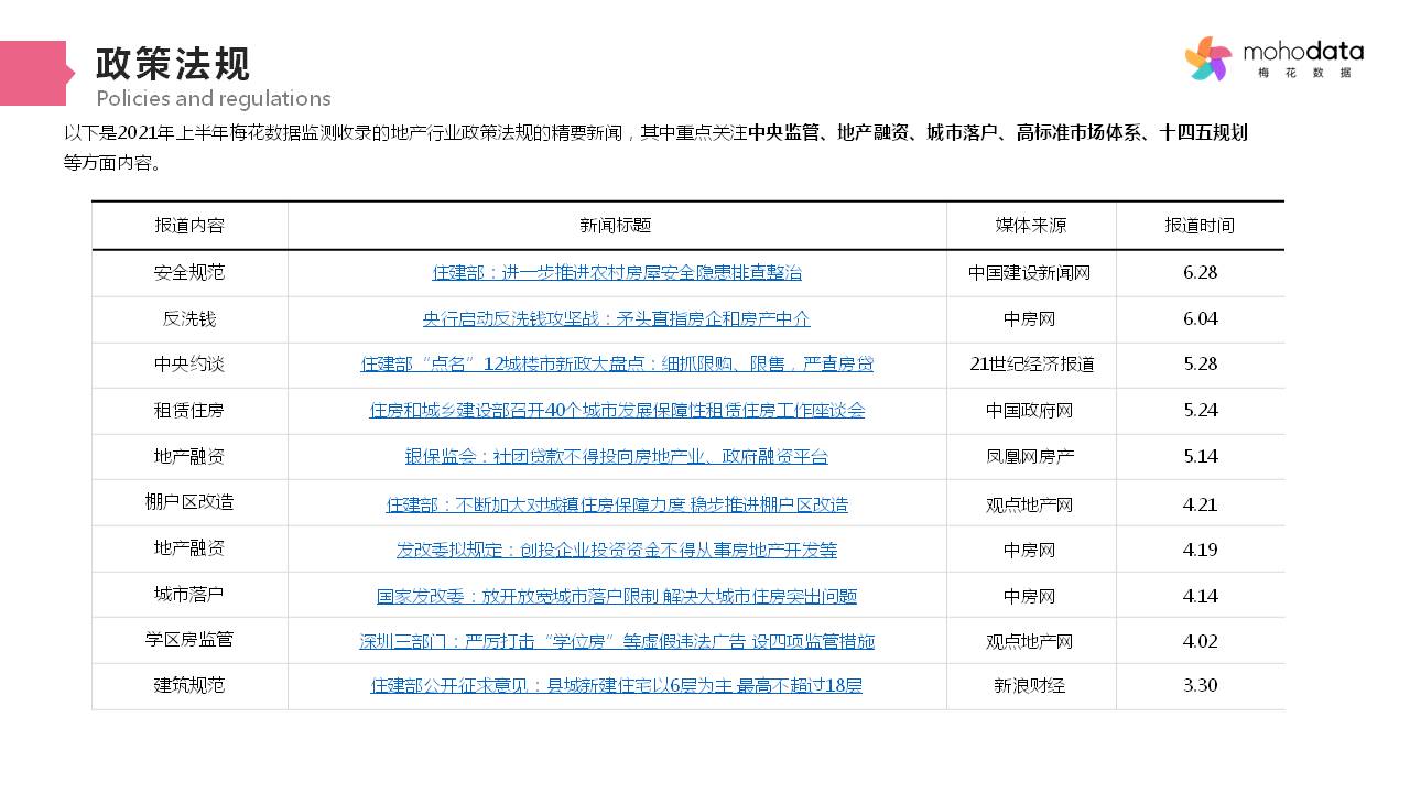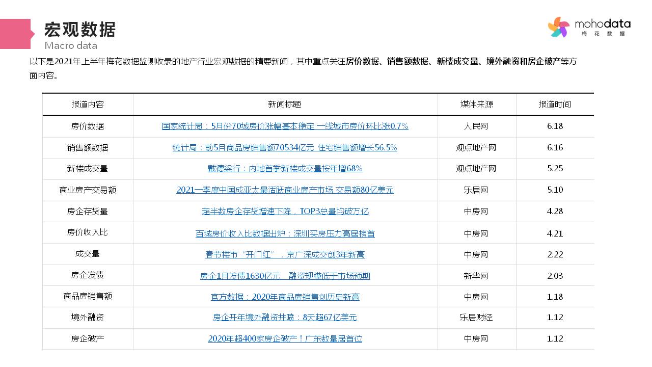 报告目的:了解2021年上半年地产行业重大舆情新闻,对上半年地产行业在政策、企业动态、市场表现、地产数据统计、土地供给、专家解读、负面事件等多方面回顾了解,掌握上半年地产行业热点。