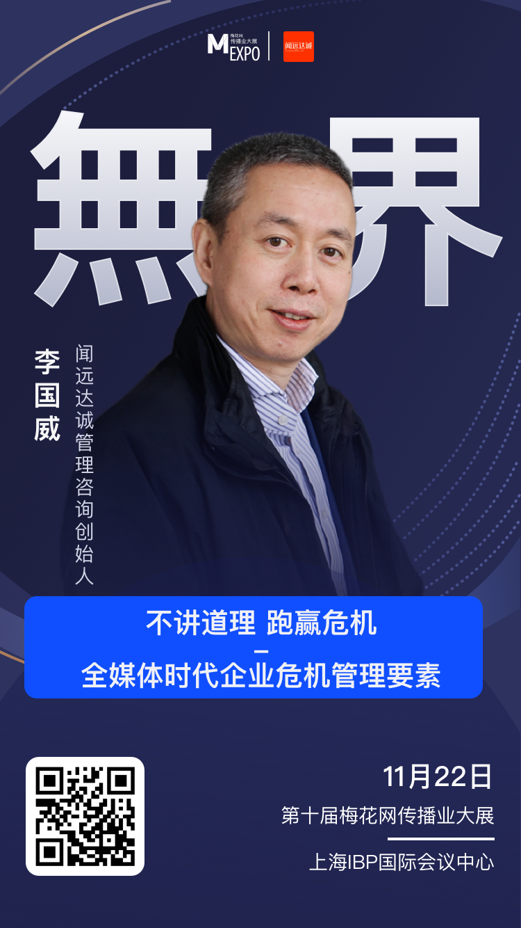 闻远达诚管理咨询创始人李国威确认受邀出席2021梅花网传播业大展-上海站并带来《不讲道理 跑赢危机 - 全媒体时代企业危机管理要素》主题演讲。