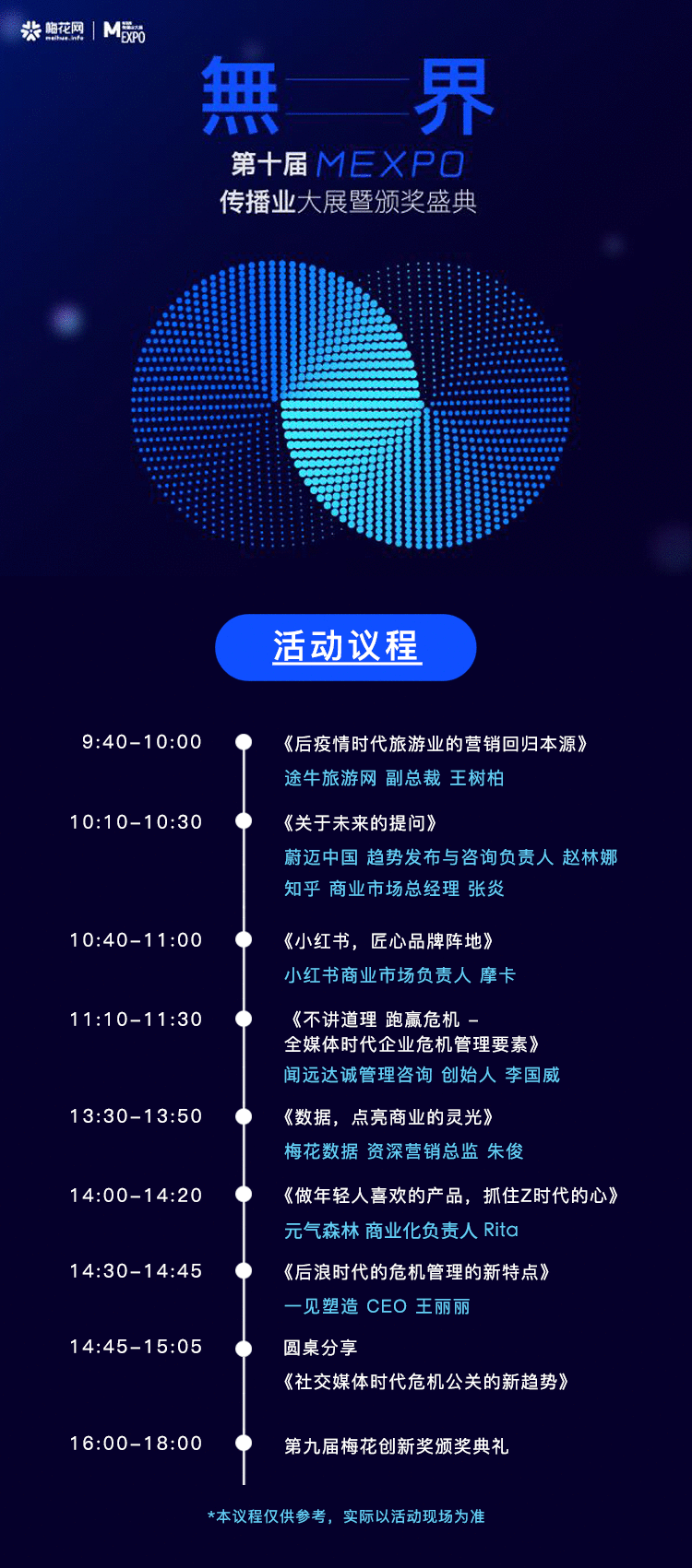 MEXPO2021将于2021年11月22日在上海IBP国际会议中心举办。本届梅花网传播业大展我们邀请到了诸多业内资深人士参与并发表主题演讲,是您不可错过的交流盛会,欢迎前往官网报名:mexpo.meihua.info