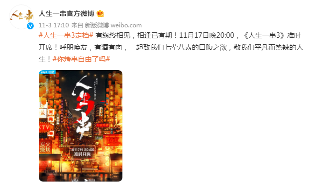 昨天晚8点,《人生一串 3》准时开席,首播当晚点击量破千万。