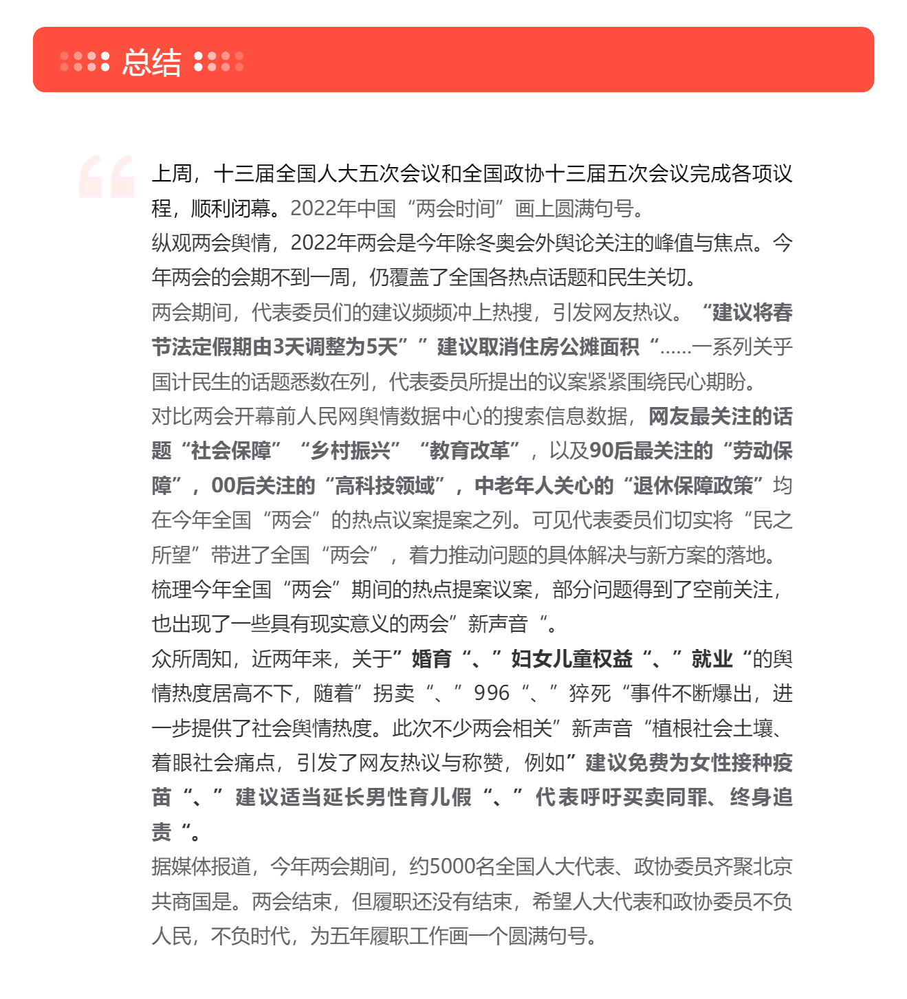 2022全国两会于3月4日正式开幕,11日圆满落下帷幕,是今年备受关注的焦点,梅花数据推出“全国两会”热榜舆情观察报告,为大家回顾两会相关热榜舆情。此外,梅花数据还制作了全国两会行业观察报告,报告整理汇总了多行业在全国两会的要点资讯,欢迎点击文末链接或扫描文末二维码下载查阅。